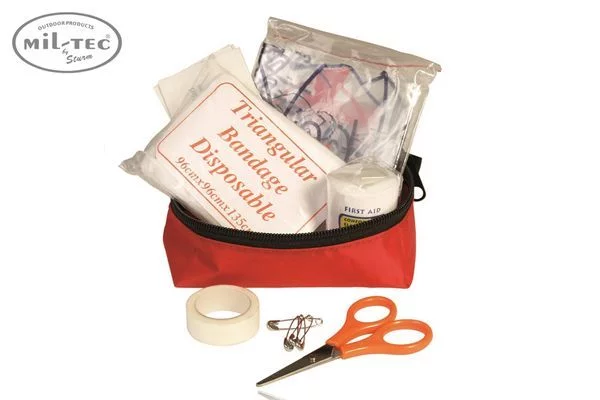 Zestaw pierwszej pomocy zapakowany w czerwony zasobnik z białym krzyżem zapinany na zamek.