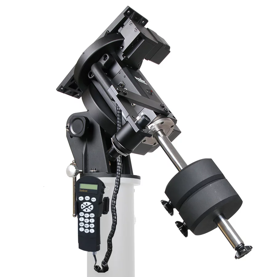 EQ8 - najpotężniejszy z rodziny paralaktycznych montaży Sky-Watchera. Jego 55-milimetrowej średnicy osie wykonane z wysokowytrzymałej stali i 22-centymetrowe przekładnie napędu są w stanie pracować z obciążeniem do 50 kg, dzięki czemu na montażu EQ8 można śmiało zawiesić profesjonalne astrografy o średnicy nawet 16 cali wraz z całym oprzyrządowaniem. Korpus głowicy wykonano w technologii CNC, zupełnie inaczej niż dotychczas gdzie dominowały różnego rodzaju odlewy. Kształt głowicy jest lekko kanciasty, typowy dla wielkich montaży paralaktycznych. Całość wykończona estetycznie, anodyzowana na czarno. Mechanika zwraca uwagę solidnością i idealnym spasowaniem elementów. Do każdego montażu wyposażonego w system Syn-Scan GO-TO polecamy dodatkowy moduł GPS, umożliwiający automatyczne i bezobsługowe ustawianie współrzędnych geograficznych miejsca i dokładnego czasu każdej obserwacji. Podwójny system enkoderów osi Opatentowany przez Sky-Watchera, podwójny system enkoderów osi pozwala na elektroniczne lub ręcznie przekierowanie teleskopu na nowy obiekt bez przerywania automatycznego śledzenia obiektu. Po ustawieniu na nowy obiekt montaż automatycznie przełącza się na jego śledzenie. Montaż nie wymaga każdorazowego wyrównywania i doskonale nadaje się między innymi, do obserwatoriów zdalnych. Silniki krokowe wysokiej rozdzielczości Montaż wykorzystuje bipolarne silniki krokowe o rozdzielczości 0,9 stopnia/krok dla zapewnienia wysokiej precyzji i kultury pracy. Napędzają one ślimaki bez jakiejkolwiek przekładni redukcyjnej, eliminując tym samym luzy mechaniczne oraz minimalizując nieregularność błędu okresowego przekładni i ziarnistość pracy napędu. Wysoką precyzję i odporność na rezonans mechaniczny krokowych silników o rozdzielczości 400 kr/obr. zapewnia nowoczesne sterowanie mikrokrokowe, o rozdzielczości 64 mikrokroków/krok, co daje 64 x 400 = 25600 impulsów sterujących na 1 zwój helikalnych przekładni o przełożeniu 1:435. Przekłada się to na wynikową dokładność pracy napędu EQ8 wynoszącą 0,116 sekundy kątowej w obu osiach. W osi rektascensji pomiędzy wałem ślimacznicy a wałem silnika zastosowano dodatkową, bezluzową przekładnię pasową o przełożeniu 1:1. Rozwiązanie takie pozwala skutecznie wyeliminować wibracje jakie mogłyby być przenoszone z napędu na kluczową oś RA teleskopu. Widmo PE montażu jest regularne i czyste, można więc bardzo dokładnie je korygować. Skomputeryzowana obsługa W komplecie z bardzo solidną mechaniką montażu jest zawarty zaawansowany kontroler SynScan, znany z topowych wersji montaży takich jak EQ6 czy HEQ5, umożliwiając z korzystania z tych samych, zaawansowanych funkcji śledzenia, korekcji i systemu GOTO. Może być także sterowany za pomocą SynScan Tour. Zaawansowana korekcja PE Stale programowalny system PEC koryguje błędy okresowe dla każdej przekładni i osi montażu. Uproszczenie mechaniki przekładni napędu zmniejsza nieregularność PE i wpływa korzystnie na efekt działania PEC. Wygodne wyrównywanie montażu Automatyczne parkowanie montażu w pozycji wyjściowej z automatycznym ustawieniem na znaczniki początkowe. Nieosiągalna do tej pory stabilność EQ8 wspiera się na niezwykle masywnym, ulepszonym statywie Super HD. Wykonany jest z walcowanej na zimno, wysokoweglowej stali i może być podniesiony na wysokość do 1347 mm. Trójnóg używa podwójnego systemu mocowania wraz z wytrzymałym wiązaniem kolumny dla równomiernego rozłożenia sił na zewnątrz i podparcia dolnego dla zwiększenia sztywności wewnętrznej trójnogu. Stabilny słup pozwala dodatkowo na regulację wysokości między 750 a 1000 mm. Dodatkowe funkcje gniazdo "Snap" - jack 2.5mm służące do wyzwalania migawki aparatów Canon. W komplecie znajduje się odpowiedni kabel pasujący do wszystkich trzy i czterocyfrowych modeli Canona. W menu pilota SynScan znajduje się opcja pozwalająca zaprogramować ilość ekspozycji, odstęp między nimi i czas ich trwania – identycznie jak w programowalnym wężyku spustowym. Nośność montażu wynosi 50 kg! UWAGA, lunetka biegunowa nie wchodzi w skład zestawu.