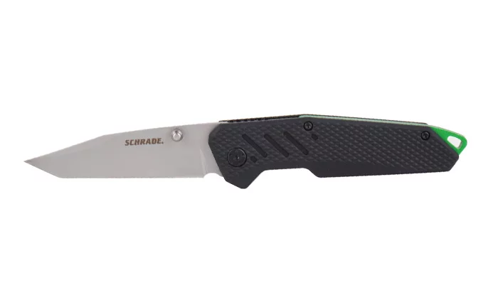 Nóż składany od firmy Schrade, z ostrzem o profilu Tanto i okładzinami rękojeści z ABS pokrytego warstwą tworzywa Kraton.
