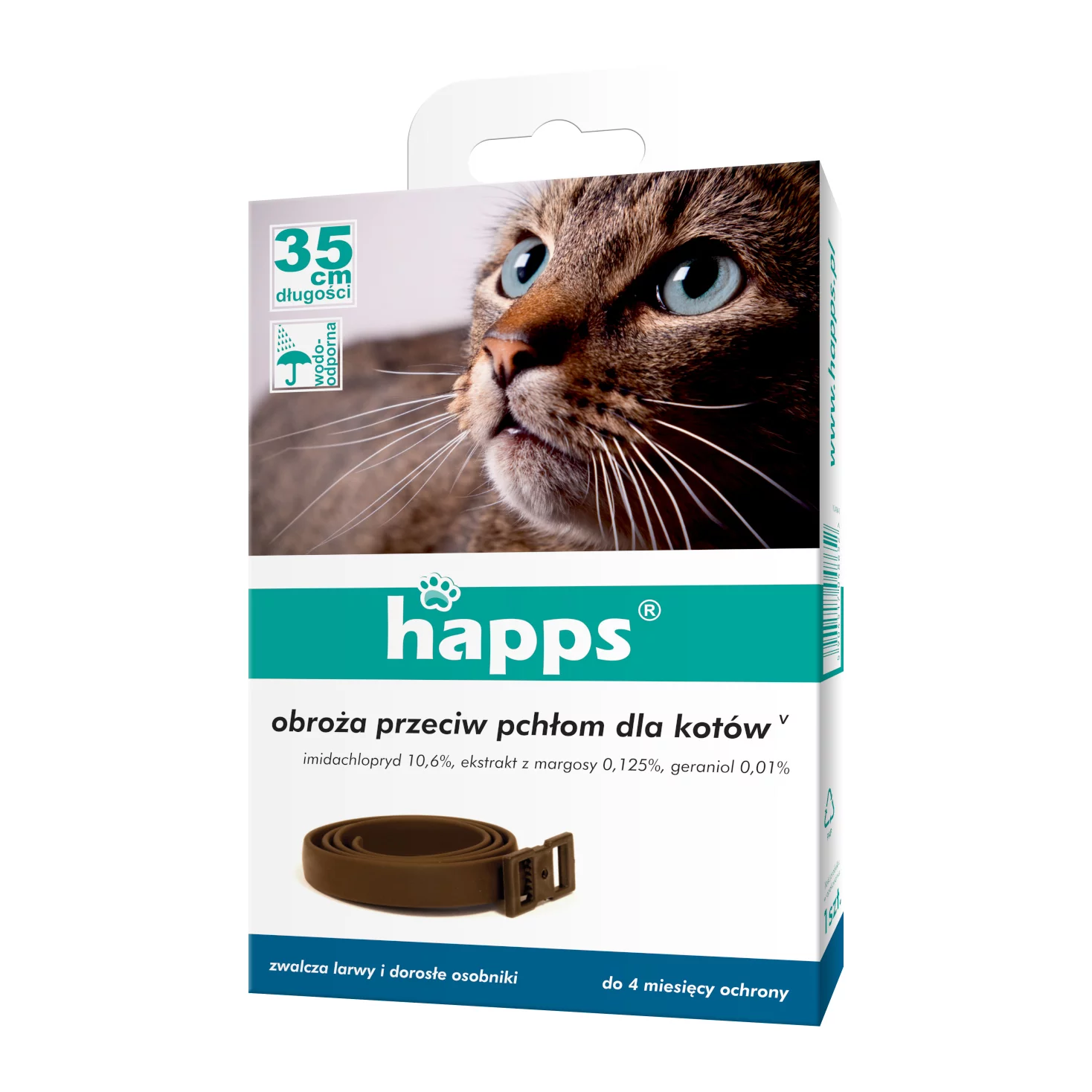 Obroża przeciw pchłom Happs dla kotów zapewnia skuteczną i długotrwałą ochronę kota przed inwazją pcheł.