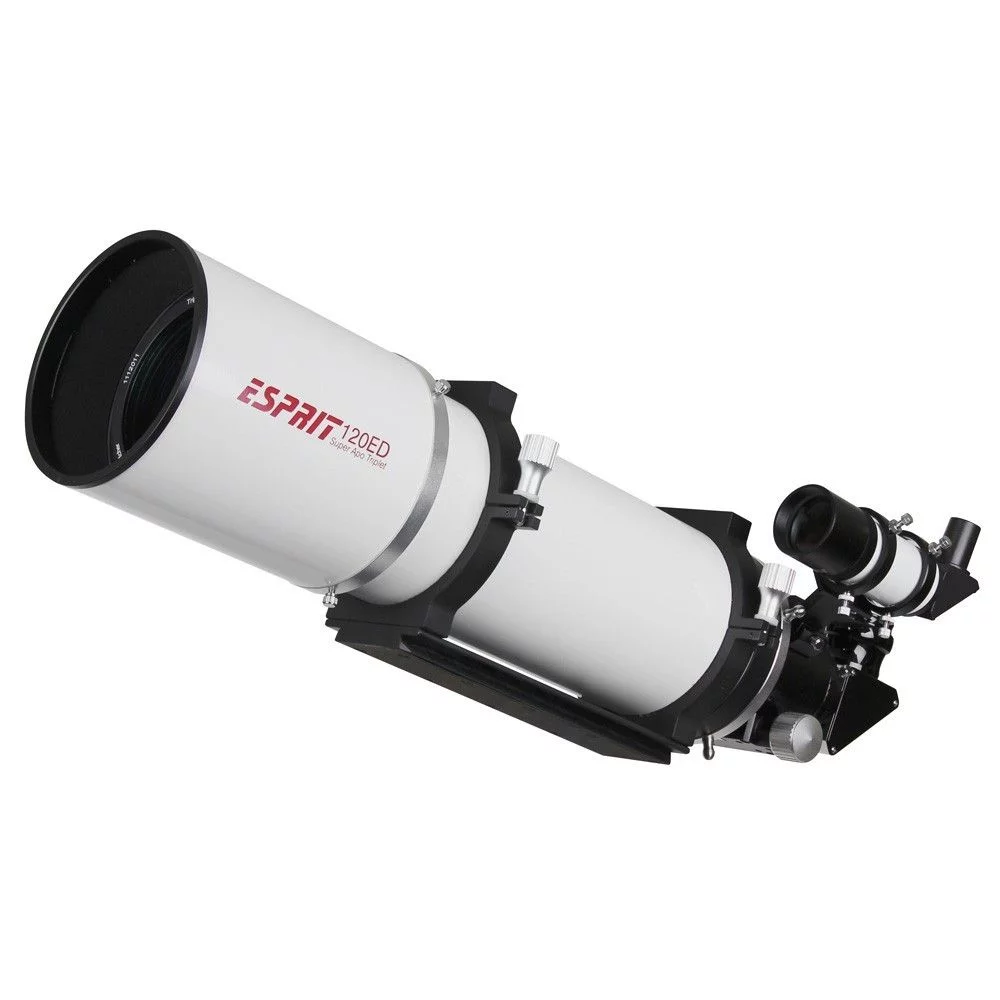 Teleskop Sky-Watcher 120mm Esprit ED Triplet APO posiada system optyczny wysokiej klasy triplet APO z dołączanym, wkręcanym flattenerem, skonstruowany z myślą o astrofotografii. To najwyższy model refraktora w ofercie Sky-Watcher, znacznie przewyższający jakością obrazu dublety ED z serii Black Diamond czy Equinox. Projekt optyczny, składający się z trzech soczewek, z których środkowa wykonana jest ze szkła niskodyspersyjnego, pozwala tu na redukcję aberracji sferycznej oraz astygmatyzmu w całym polu widzenia. Teleskop ten mimo znacznej światłosiły f/7 wolny jest od wad pozaosiowych, astygmatyzmu, dystorsji i aberracji chromatycznej.Cała seria Esprit składająca się z apochromatów o parametrach 80mm F/5, 100mm F/5.5, 120mm f/7 i 150mm F/7 została od podstaw zaprojektowana jako zaawansowane astrografy dla wymagających, ale mogą także służyć jako najwyższej klasy teleskopy wizualne o niedoścignionym kontraście, rozdzielczości, dużym płaskim polu i całkowitej korekcji wad pozaosiowych. Optyka ED do tych teleskopów produkowana jest w japońskiej fabryce Ohara, pozostałe elementy wykonane są ze szkła Schott. Teleskop wyposażony jest wyciąg okularowy Crayforda Sky-Watcher z najwyższej serii Linear Power z mikrofocuserem 11:1, stalową bieżnią i czterema łożyskami maszynowymi gwarantującymi wysoką obciążalność i brak przesunięć. Jego średnica wynosi 3", czyli brak winietowania przy pełnoklatkowych sensorach. Dodatkowo, na drawtube naniesiona jest indeksowana skala i są dołączone adaptery okularowe - nakręcany adapter 3/2" i zaciskowy 2/1,25".Sky-Watcher Esprit 120mm F/7 to potężny refraktor-astrograf i zarazem fascynujący teleskop dla obserwatorów - miłośników refraktorowych obrazów najwyższej jakości. 75-milimetrowy backfocus i wyciąg Linear Power o średnicy 3" nie tylko pozwalają podpiąć ciężkie kamery CCD bez utraty osiowości, ale też zapewnia 43mm średnicy niewinietujące pole pokrycia obrazem. Wysokiej jakości powłoki antyodblaskowe MHT i cały system bafli wewnątrz tubusa redukuje wszelkie odblaski i wzmacnia kontrast. Dodatkowo, do obserwacji wizualnych dołączony jest wysokiej klasy okular Sky-Watcher LET 28mm i 2" dielektryczna nasadka kątowa.
