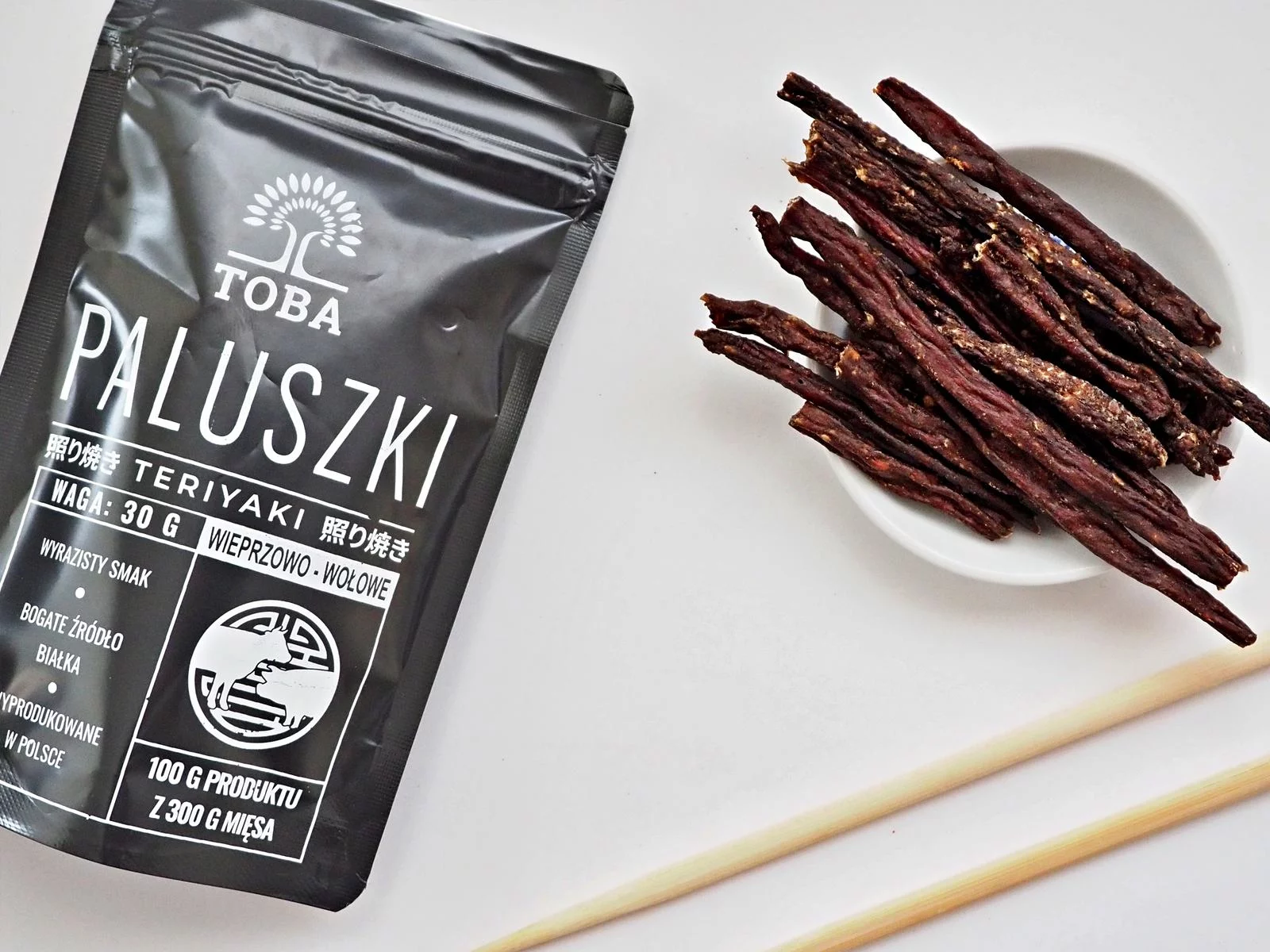 Paluszki wieprzowo-wołowe Toba teriyaki 30 g to smaczna przekąska, wyprodukowana z 300 g wysokiej jakości surowego mięsa na 100 g produktu.