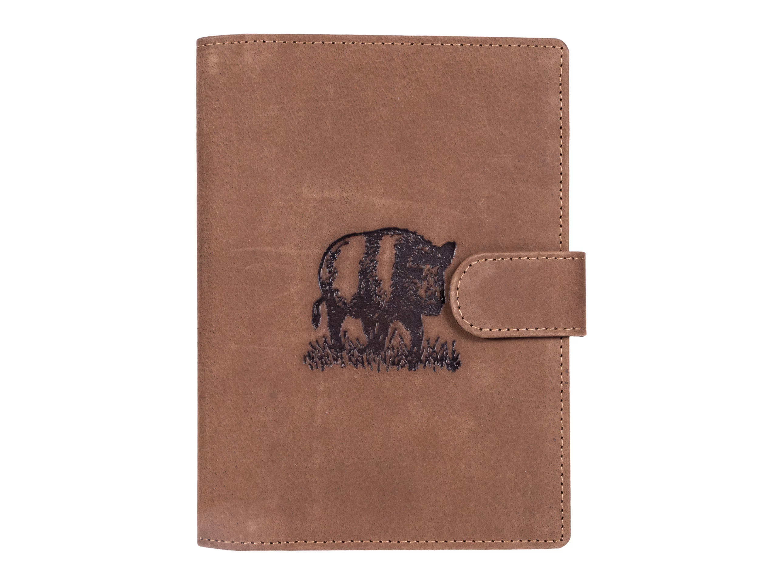Skórzane etui na dokumenty to ponadczasowy i praktyczny prezent, który doceni każdy mężczyzna. Na przedniej i tylnej ściance laserowo naniesiono grafikę ze motywem dzika oraz jego tropów . Etui wykonano ręcznie w czeskiej pracowni Zubicek, z wysokiej jakości skóry bydlęcej wykończonej techniką szczotkowania.