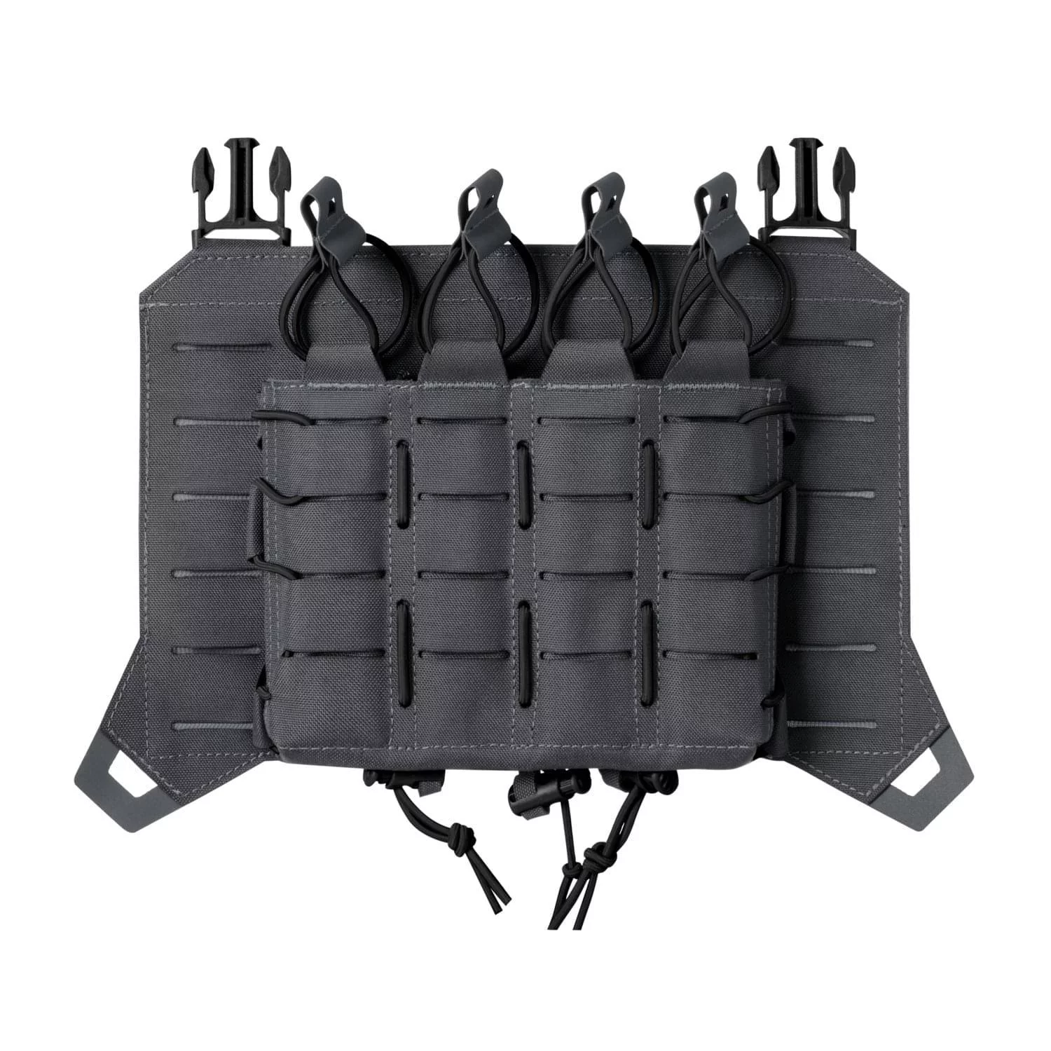 Kieszenie wyposażone są w regulację wysokości oraz boczne ściany z elastycznych ściągaczy, dzięki czemu mogą zmieścic magazynki o różnej wielkości.Przednia powierzchnia kieszeni pokryta została laserowo ciętym systemem modułowym kompatybilnym z systemem mocowań MOLLE/PALS.