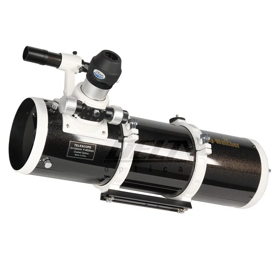 Tuba teleskopu 130/650 oferuje wyjątkową cenę, mobilność oraz bogate wyposażenie. Jest idealnym modelem do wprowadzenia w świat astronomii amatorskiej i często wybierany jako pierwszy teleskop w rodzinie. Jako jedne z pierwszych małych amatorskich teleskopu wyposażony został w paraboliczne zwierciadło główne, dzięki czemu unikamy jednej z wad optycznych – aberracji sferycznej. Teleskop ma optymalną światłosiłę i dość duże już zwierciadło, umożliwiając dokonywanie ciekawych obserwacji. System optyczny Teleskop zwierciadlany (system Newtona). Ze względu na jasność teleskop szczególnie polecamy do obserwacji obiektów mgławicowych. Model ten sprawdzi się także podczas obserwacji obiektów planetarnych a także kraterów Księżyca. Główną zaletą tego teleskopu jest duże 130 mm paraboliczne zwierciadło, które jest najważniejszym elementem teleskopu, który decyduje o tym co i jak będziemy mogli obserwować. Teleskop ten zbiera około 240 razy więcej światła niż ludzie oko w nocy, zapewniając możliwość obserwacji obiektów do prawie 12 wielkości gwiazdowej (przy widoczności gołym okiem do 6 wielkości gwiazdowej). Wielkość zwierciadła związana jest również z rozdzielczością optyczną, która w tym teleskopie umożliwia rozdzielanie gwiazd, które są odległe od siebie więcej niż 1,1”. Montaż Teleskop bez montażu. Wyciąg Teleskop wyposażony jest wyciąg okularowy z mikroruchami, umożliwiający stosowanie okularów 2” oraz 1,25”. Do zestawu dołączono okular o takiej średnicy. Obserwacje astronomiczne 1. Układ Słoneczny obiekty na powierzchni księżyca o rozmiarach większych niż 1-2 km; plamy słoneczne i ich struktura; wszystkie planety Układu Słonecznego; fazy Merkurego i Wenus tarcza Marsa pasy równikowe Jowisza i księżyce Galileuszowe pierścienie Saturna i największy księżyc Tytan, w polu widzenia mogą pojawiać się kolejne słabsze księżyce Uran i Neptun ruch planetoid na tle gwiazd obserwacje jasnych komet 2. Gwiazdy około 1,9 mln gwiazd na całym niebie, o jasności do około 12–12,5 magnitudo gwiazdy podwójne i wielokrotne oddzielone od siebie kątowo na więcej niż 1,1". barwy najjaśniejszych gwiazd 3. Obiekty mgławicowe prawie wszystkie obiekty katalogu Messiera dziesiątki, a nawet setki gromad kulistych setki gromad otwartych kilkadziesiąt mgławic dziesiątki galaktyk Obserwacje naziemneTeleskop z tego rodzaju optyką nie nadaje się dość dobrze do obserwacji naziemnych. Do odwrócenia obrazu należy użyć tzw. soczewki prostującej, dzięki której odwrócimy obraz do naturalnego (prostego). Wraz z soczewką prostująca i montażem na którym został zamieszczony można go używać jako prostego przyrządu do obserwacji naziemnych.