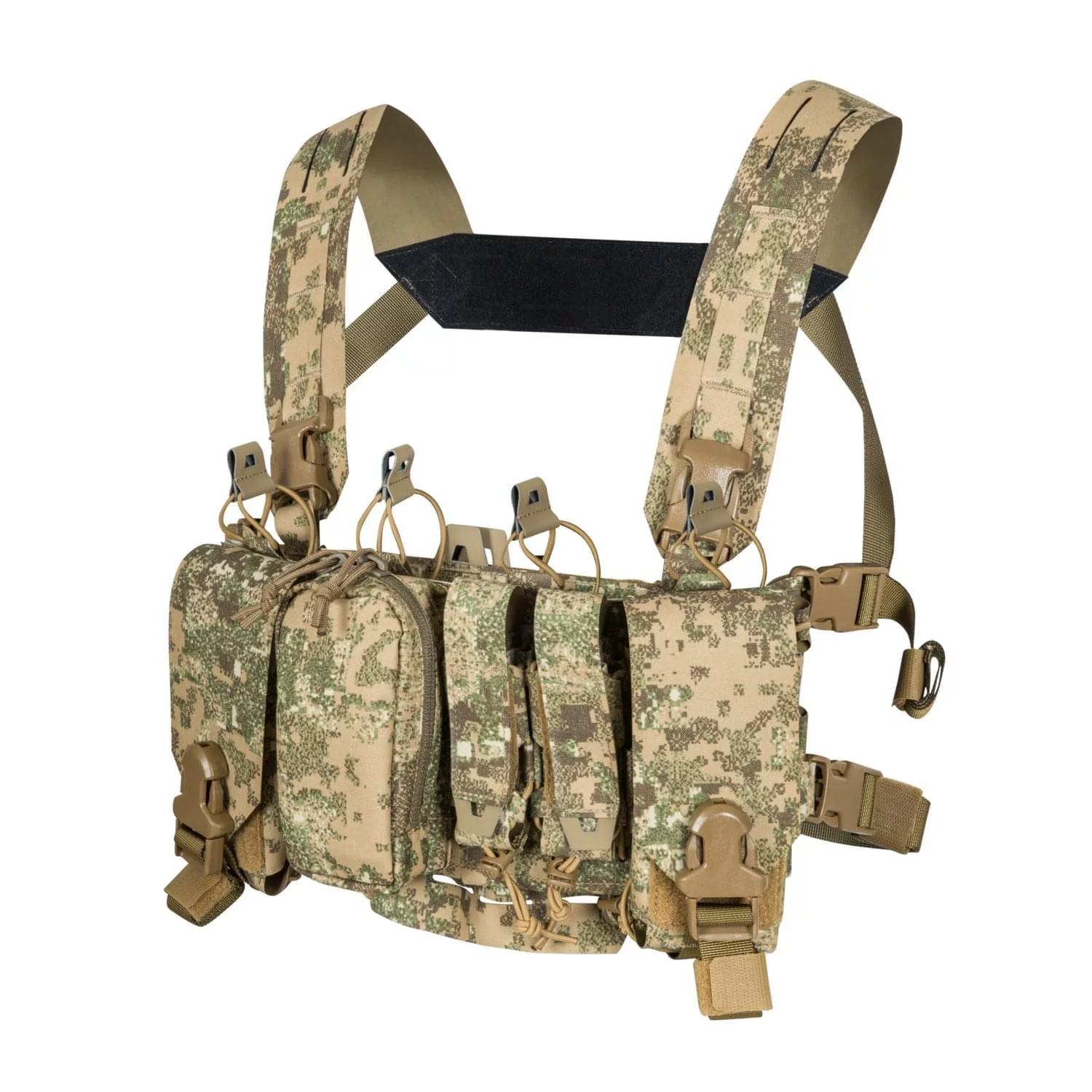 Kamizelka taktyczna typu chest rig wykonana z odpornej na przetarcia Cordury 500D z delikatnym podszyciem. Wyposażona w panel, na którym znajdują się z kieszenie typu Open Top na akcesoria i dodatkowe magazynki. Ładownice wyposażone zostały w shockordy, która zapobiegają wypadnięciu magazynków podczas poruszania się.System nośny stanowią komfortowe szelki, które mocowane są do panelu za pomocą dwóch mocnych klamer Duraflex. Stabilne noszenie zapewnia zapinany z obu stron klamrami szeroki pas.Kamizelka wyposażona została w:- dwie zamykane na rzepy, regulowane kieszenie na magazynki z odpinaną klapką,- mniejszą kieszeń zamykaną na zamek błyskawiczny,- niskoprofilową, regulowana uprząż z otworami PTT,- płaską kieszeń wewnętrzna na wysokości klatki piersiowej,- poziomy rząd MOLLE/PALS do montażu dodatkowych kieszeni