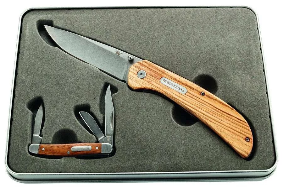 Scyzoryk STAGECOACH i nóż HEEL SPUR to dwa z najpopularniejszych modeli marki WINCHESTER. Noże w tym zestawie znajdują się w ozdobnym opakowaniu prezentowym. Model HEEL SPUR to solidny nóż składany z blokadą typu Linerlock stanowiący idealne rozwiązanie do codziennego użytku, natomiast STAGECOACH to klasyczny scyzoryk o trzech ostrzach z różnymi profilami głowni (clip point, sheeps foot, drop point) nawiązującym do modelu noża pasterskiego. Oba modele noży odznaczają się ozdobnym gatunkiem drewna na rękojeści tzw. Zebrano i posiadają ostrza wykonane ze stali nierdzewnej 7Cr17MoV.