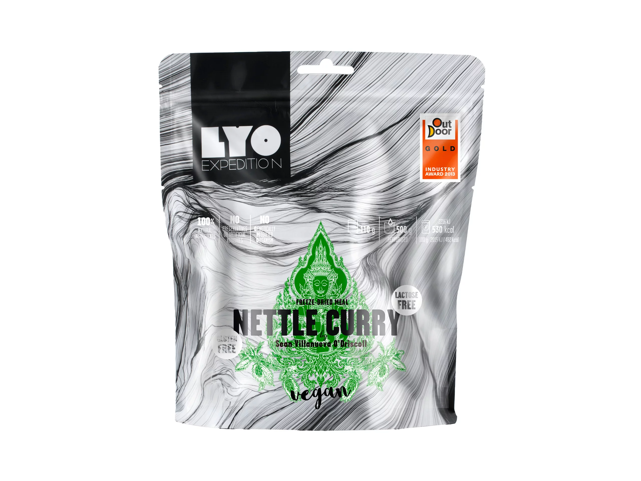 LyoFood Zielone curry z pokrzywą Sean Villanueva o'Driscoll 500 g to wegetariańskie, bezglutenowe danie stworzony wspólnie ze światowej sławy wspinaczem- Seanem Villaneuva O'Ddriscoll będącym ambasadorem marki Lyofood.